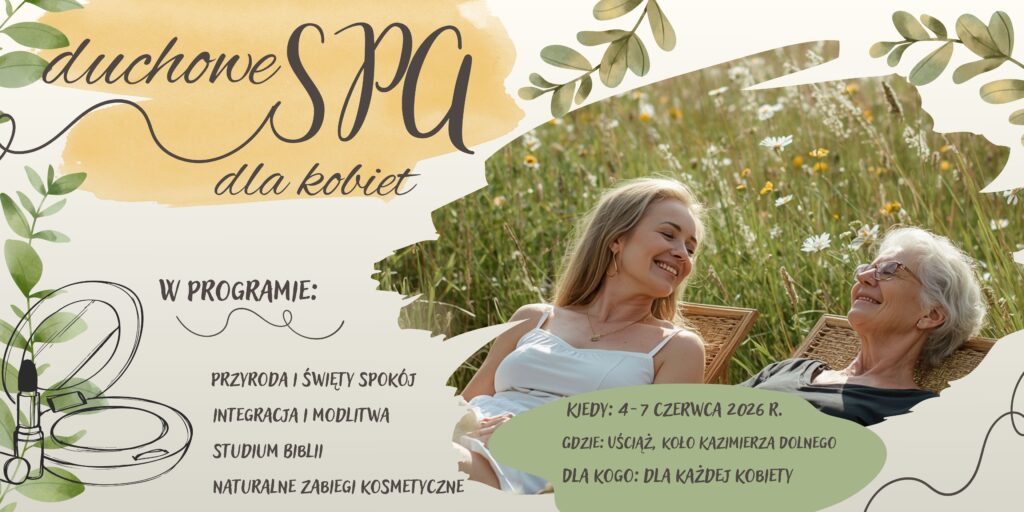 Duchowe SPA to program dla kobiet (tylko!), podczas którego naładujesz swoje “duchowe akumulatory”, ucząc się od kobiet opisanych na kartach Biblii, skorzystasz z zabiegów pielęgnacyjnych i relaksacyjnych, a także z możliwości wdychania świeżego, leśnego powietrza, z ciszy i spokoju przyrody oraz z towarzystwa i wsparcia innych pań. Celem tego programu jest integracja kobiet, wzajemne wsparcie, rozwój życia duchowego oraz dbanie o ciało i urodę.