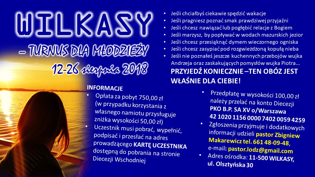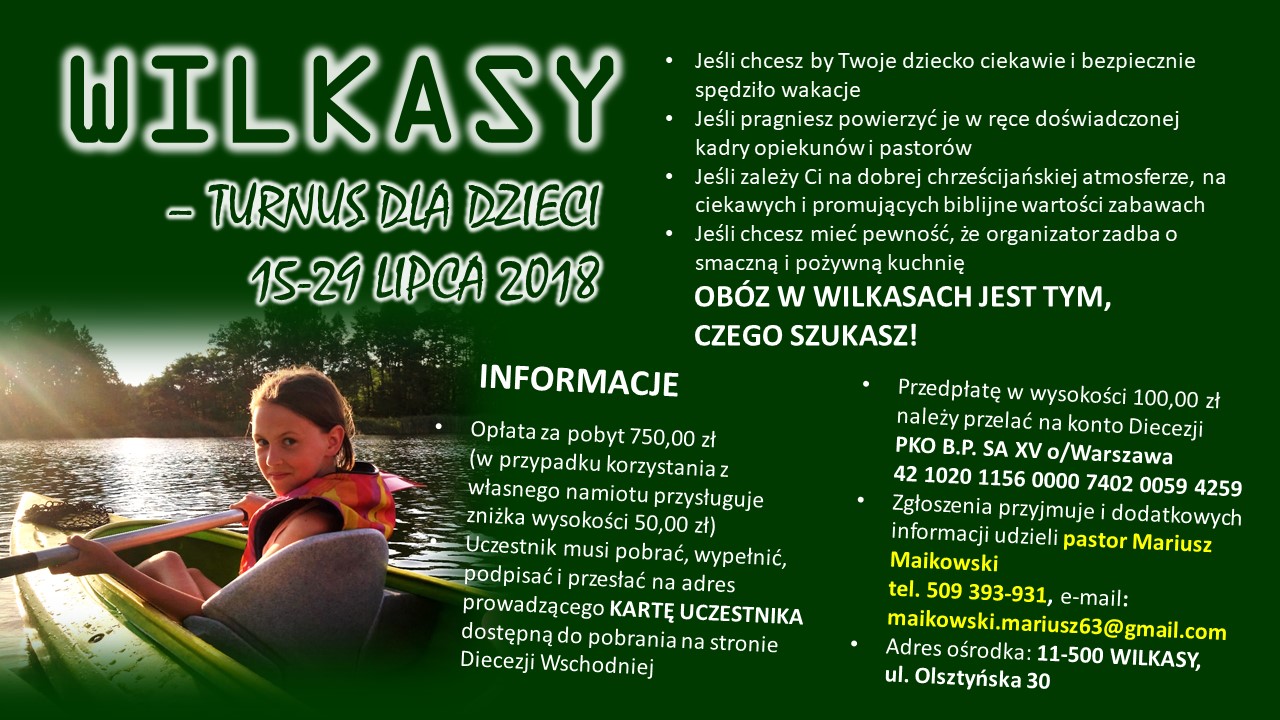 Z prawdziwą radością informujemy, że zgodnie z wieloletnią tradycją także w tym roku planowane są obozy wypoczynkowe dla dzieci i młodzieży w Wilkasach. Turnus dla dzieci odbędzie się w terminie 15-29 lipca, poprowadzą go pastorzy Mariusz Maikowski i Andres Torres. Obóz dla młodzieży odbędzie się w terminie 12-26 sierpnia, a prowadzony będzie przez pastorów Zbigniewa Makarewicza oraz Tarasa Semeniuka.